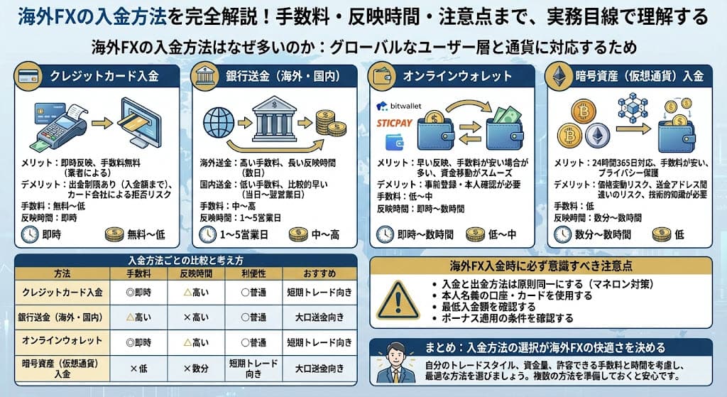 本記事では、海外FXにおける主要な入金方法を一つずつ整理し、